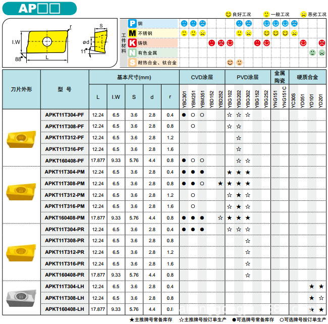 | P/M | YBM251 | YBM251 钢,不锈钢材料的半精铣及粗铣。 | CVD涂层 |