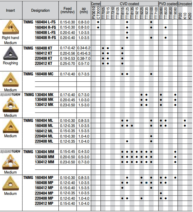 | P/M/S | TT8020 | TT8020 不锈钢,稀有合金,低碳钢的中低速车削,韧性很好的车削牌号,不锈钢和稀有合金的断续加工。 | PVD涂层 |
