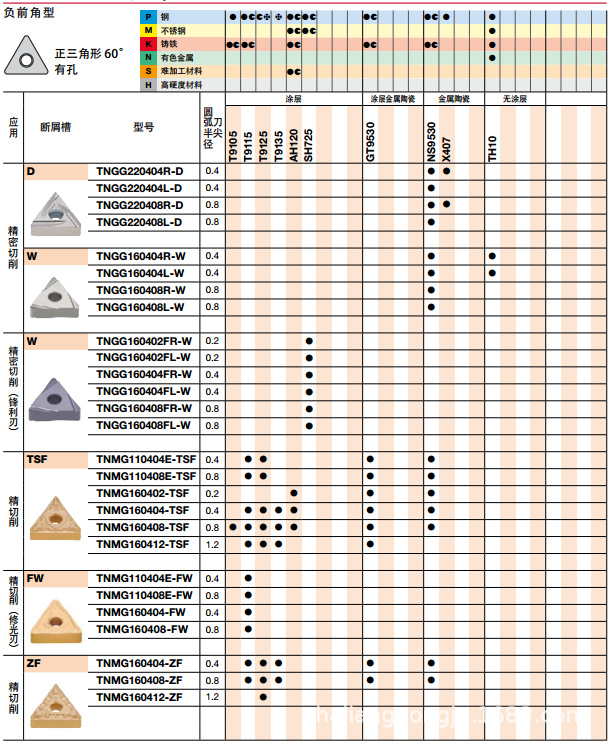 | M | T6030 | T6030 不锈钢的低速-中速加工领域,有极高抗崩刃性,连续断续切削 | CVD涂层 |