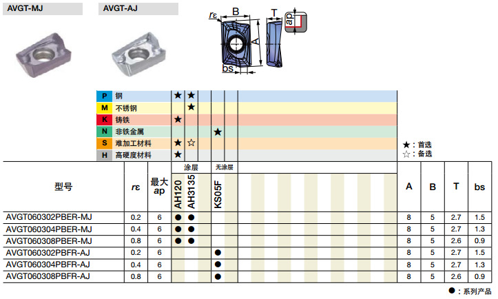 | P | AH130 | AH130 钢、不锈钢加工用材质 韧性、抗崩刃性等优良的高可靠性通用材质 | PVD涂层 |