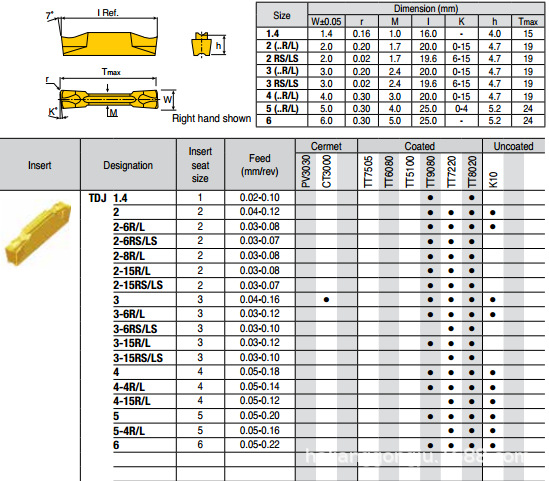 | 分类 | 型号 | 切断、切槽材质描述 | 涂层 |