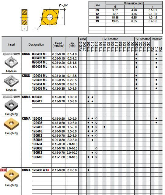 | M/S | TT9080 | TT9080 超硬的亚细微粒基体,不锈钢,高温合金的小零件车削。 | PVD涂层 |