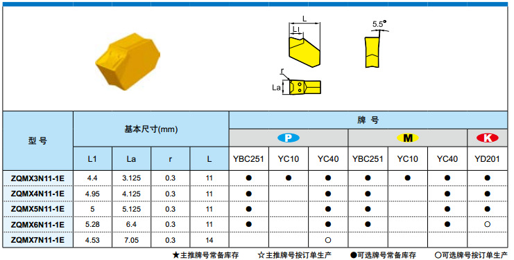 | P/M/S | YBG302 | YBG302 钢,不锈钢,高温合金材料的切断、切槽加工,实现了安全性和耐磨性能的完美结合。 | PVD涂层 |