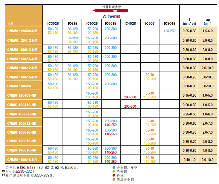 | P.M | IC9025 | IC9025 CVD 涂层 P20-P30,M15-M30,基体表面附有TiCN/AL2O3/TiN多种涂层材质,CVD涂层。特别适合于锻钢、低碳钢和低合金钢的车削和切槽;并且对不锈钢的精、半精加工也十分有效。 |