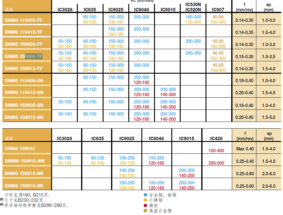 | M.N | IC520 | IC520 PVD 涂层 M05-M15,N05-N15 基体表面附有TiN/TiCN/TiN涂层材质,PVD涂层。适用于奥氏体不锈钢和硬度低的材料的车削 |