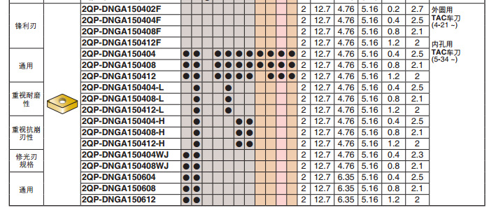 | H | BX310 | BX310 淬火钢高速连续加工用材质 使用耐磨性优良的特殊粘结剂,高速连续加工性能优良 | 超高压烧结体T-CBN |
