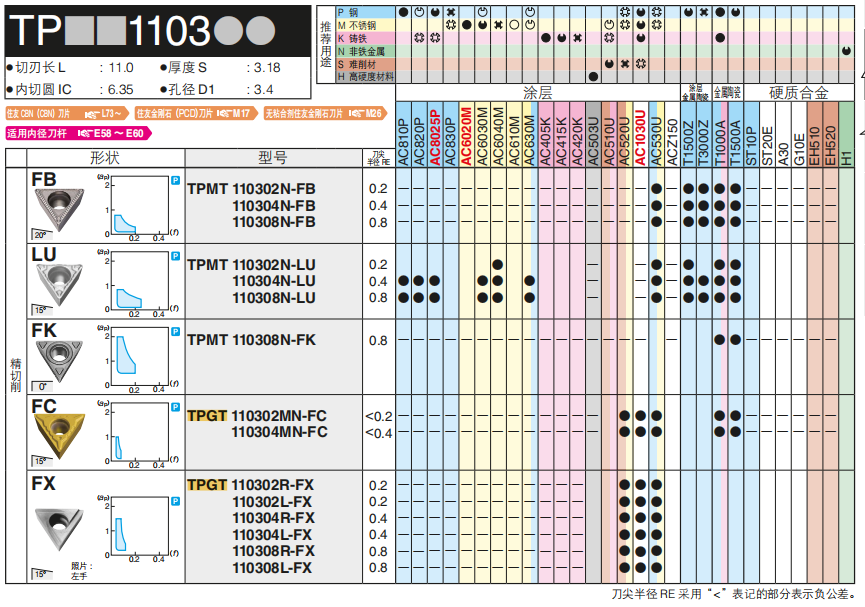 日本住友数控刀片 镗孔刀片 TPGT110308R-FY AC530U 内孔刀片