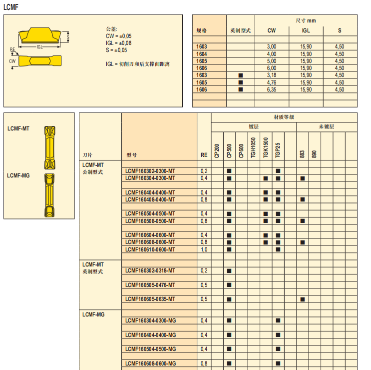 | TM2000 | TM2000 技术镀层材质等级。髙耐磨性的优化材质等级适用于不锈钢加工,并具有加工软钢的能 力。 | CVD涂层 |