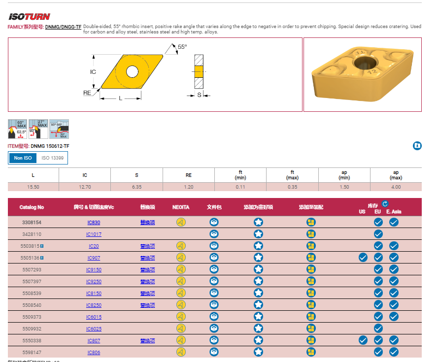 ISCAR数控车刀片 菱形车刀片DNMG150612-TF IC9150钢件加工