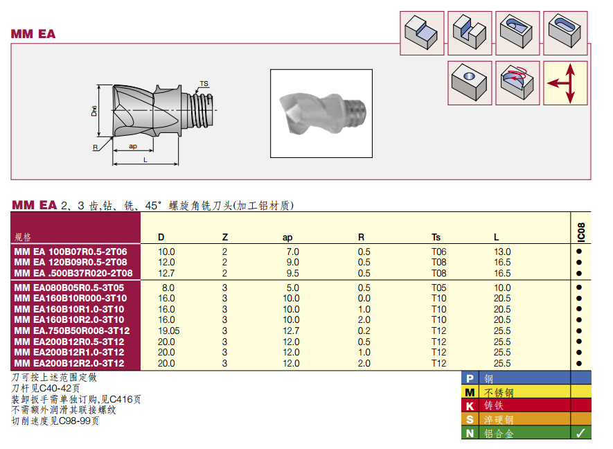 | M.K.N.S.H | IC20 非涂层 M10-M25,K10-K20,N05-N25,S05-S20,H05-H15 非涂层的硬质合金材质,用于在低-中速和进给切削条件下,铝合金、铸铁和不锈钢的半粗、半精、精加工 | 非涂层 |