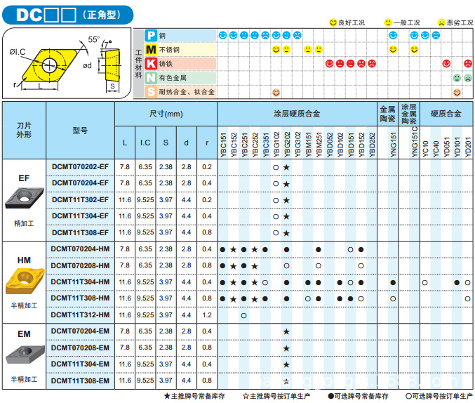 | M | YBM153 | YBM153 切削效率要求较高、切削工况稳定的不锈钢高速半精、精车削加工场合。 |