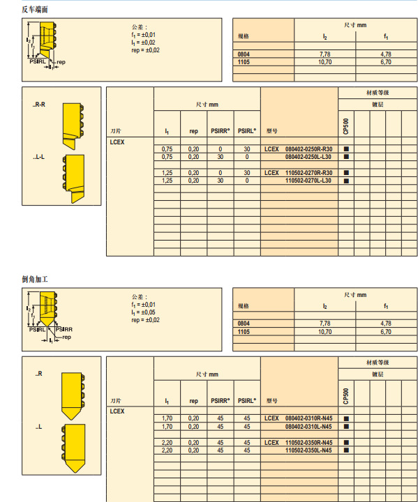 | M | MM4500 | 针对双相不锈钢韧性极佳的材质等级。也适用于宽范围的材料在不稳定的切削工况。 |