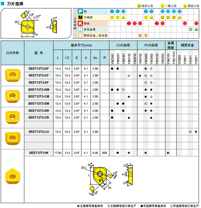 | P/M | YBM251 | YBM251 钢,不锈钢材料的半精铣及粗铣。 | CVD涂层 |