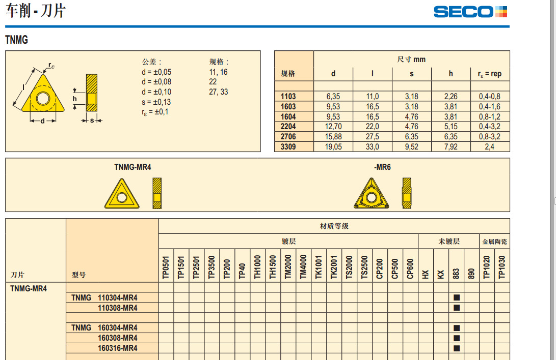 | M | TM2000 | TM2000 技术镀层材质等级。髙耐磨性的优化材质等级适用于不锈钢加工,并具有加工软钢的能 力。 |