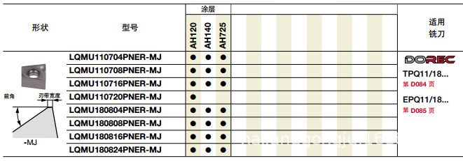 | P | AH120 | AH120 钢件的铣削加工的通用材质 | PVD涂层 |