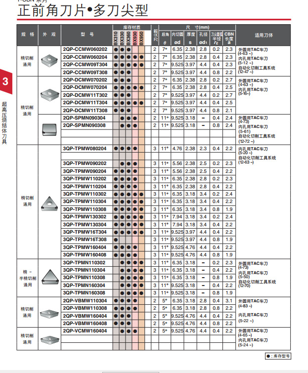 | H | BX330 | BX330 淬火钢精加工用材质 用特殊粘结剂结合微粒CBN,刃口保持性良好,在精加工时发挥优良的性能 | 超高压烧结体T-CBN |