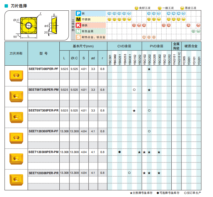 | P/M | YBC302 | YBC302 硬度为HRC45及以下的钢,不锈钢类材料的粗铣及半精铣及粗铣。 | CVD涂层 |
