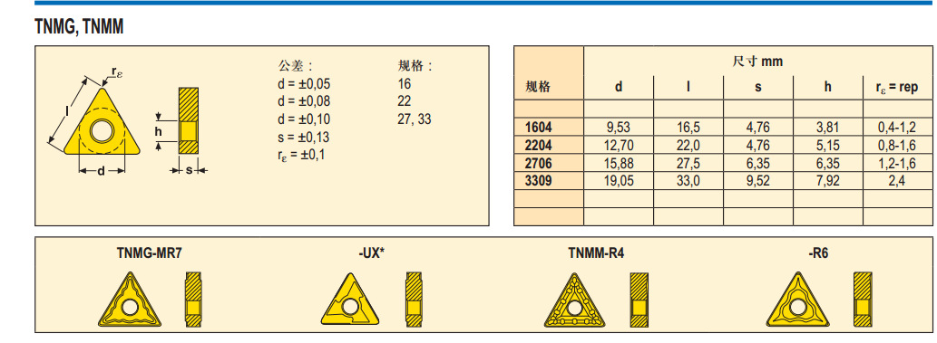 | P、M | TP40 | TP40 用于极其可靠性能的通用材质等级,适用于大多数钢件、不锈钢到髙温合金加工的髙要求应用,尤其 是铸件和锻件。 | CVD涂层 |